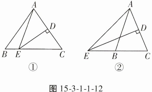 (1)如图 15-3-1-1-12①,当点 E 在 CB 边上时,若∠BAE = 15°,求∠B 的度数;