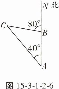 4. 如图15-3-1-2-6,上午10时,一条船从A处出发以20 kn的速度向正北航行,中午12时到达B处,从A,B处望灯塔C,测得∠NAC = 40°,∠NBC = 80°。求从B处到灯塔C的距离。