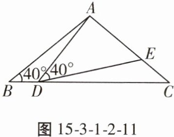 9.(分类讨论)如图15-3-1-2-11,在△ABC中,AB = AC = 2,∠B = 40°,点D在边BC上运动(D不与B,C重合),连接AD,作∠ADE = 40°,DE交边AC于点E。