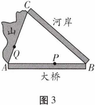 4. 如图 3,一个旅游船从大桥 $ AB $ 上的 $ P $ 处前往山脚下的 $ Q $ 处接游客,然后送往河岸 $ BC $ 上,再回到 $ P $ 处,请画出旅游船的最短路线。