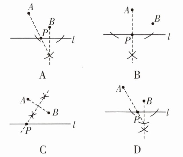 1. 已知点 $ A,B $ 都在直线 $ l $ 的上方,试用尺规作图在直线 $ l $ 上求作一点 $ P $,使得 $ PA + PB $ 的值最小,则下列作法正确的是 (