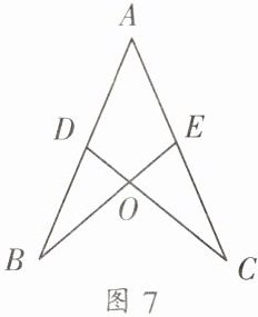 2. 如图7,点$D在AB$上,点$E在AC$上,$CD与BE相交于点O$,且$AD = AE$,$AB = AC$,若$\angle B = 35^{\circ}$,则$\angle C = $