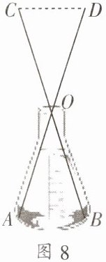 1. 数学课上,老师布置了“测量锥形瓶内部底面内径”的任务. 小亮想到了如下方案:如图8,用螺丝钉将两根小棒$AD$,$BC的中点O$固定,利用全等三角形的性质,只要测得$C$,$D$之间的距离,就可知道内径$AB$的长度. 此方案中,判定$\triangle AOB\cong\triangle COD$的依据是(