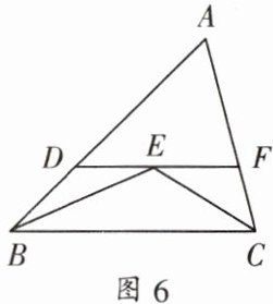 2. 如图 6,在 $\triangle ABC$ 中,已知 $\angle ABC$ 和 $\angle ACB$ 的平分线相交于点 $E$,过点 $E$ 作 $DF// BC$,交 $AB$ 于点 $D$,交 $AC$ 于点 $F$。有下列结论:(1)$\triangle BDE$、$\triangle CEF$ 都是等腰三角形;(2)$DF = BD + CF$;(3)$AD + DF + AF = AB + AC$;(4)$2DF>BE + EF$。正确的有(