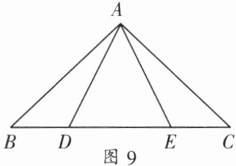 4. 如图 9,$E$、$D$ 是 $\triangle ABC$ 中 $BC$ 边上的两点,$AD = AE$,$AB = AC$。