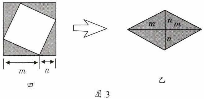 12. 如图3甲是一个边长为$m + n$的正方形,小颖将图甲中的阴影部分拼成图乙的形状,由图甲和图乙能验证的式子是(
