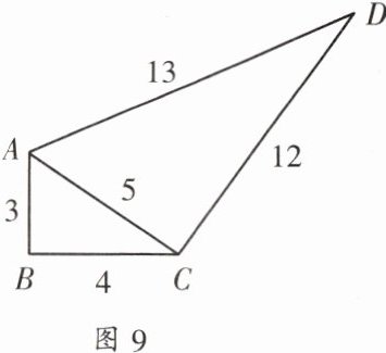1. 一个零件的形状如图 9 所示,按规定这个零件中$\angle B和\angle ACD$都应为直角,工人师傅量得这个零件各边尺寸如图所示,这个零件符合要求吗?
