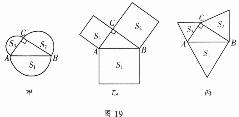 (1)如图19乙,分别以Rt△ABC三边为边向外作三个正方形,其面积分别用$S_1、$$S_2、$$S_3$表示,那么$S_1、$$S_2、$$S_3$之间有什么关系?