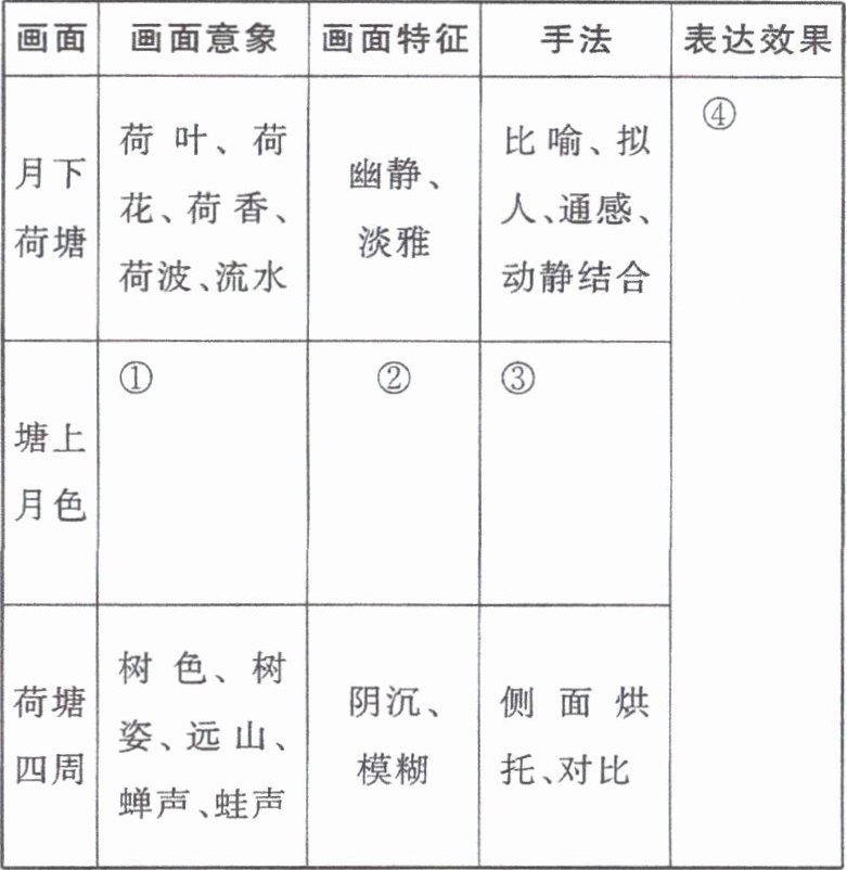 2. 《荷塘月色》最突出之处就是写景的细腻生动与手法多样。请结合文本填写下面的表格。