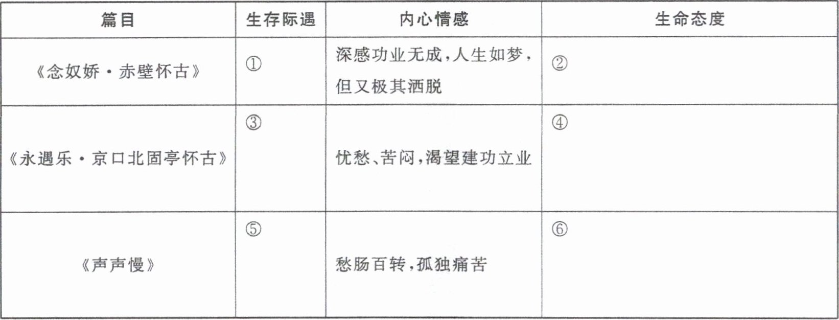 1. 本单元三首宋词均表达了词人的生存际遇和精神追求。请结合诗歌填写下表。
