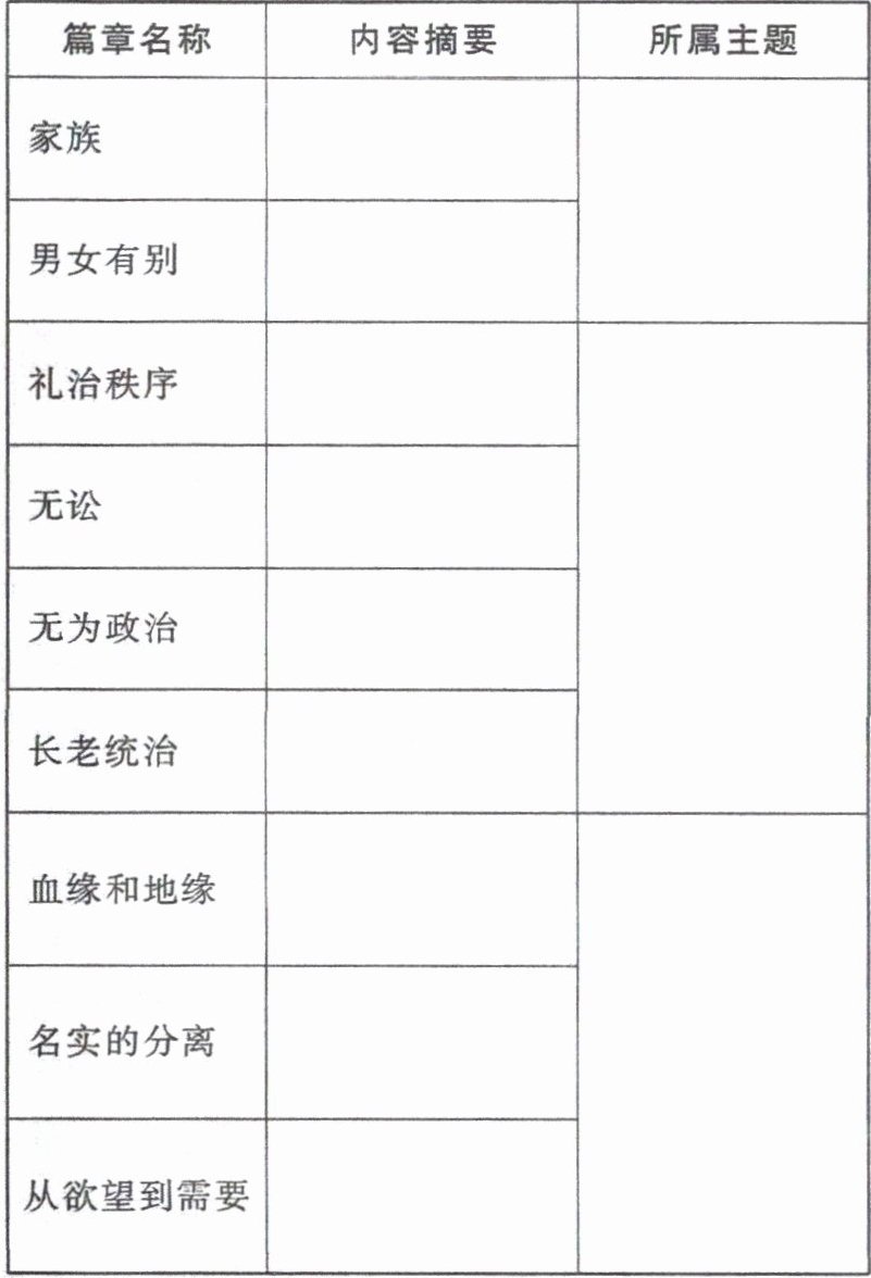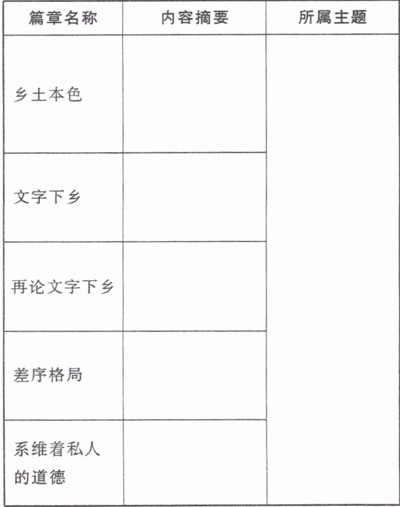 《乡土中国》的每一章节都可看作一篇独立的学术论文,请你用摘要的形式概括每章的主要内容,并进行主题分类。