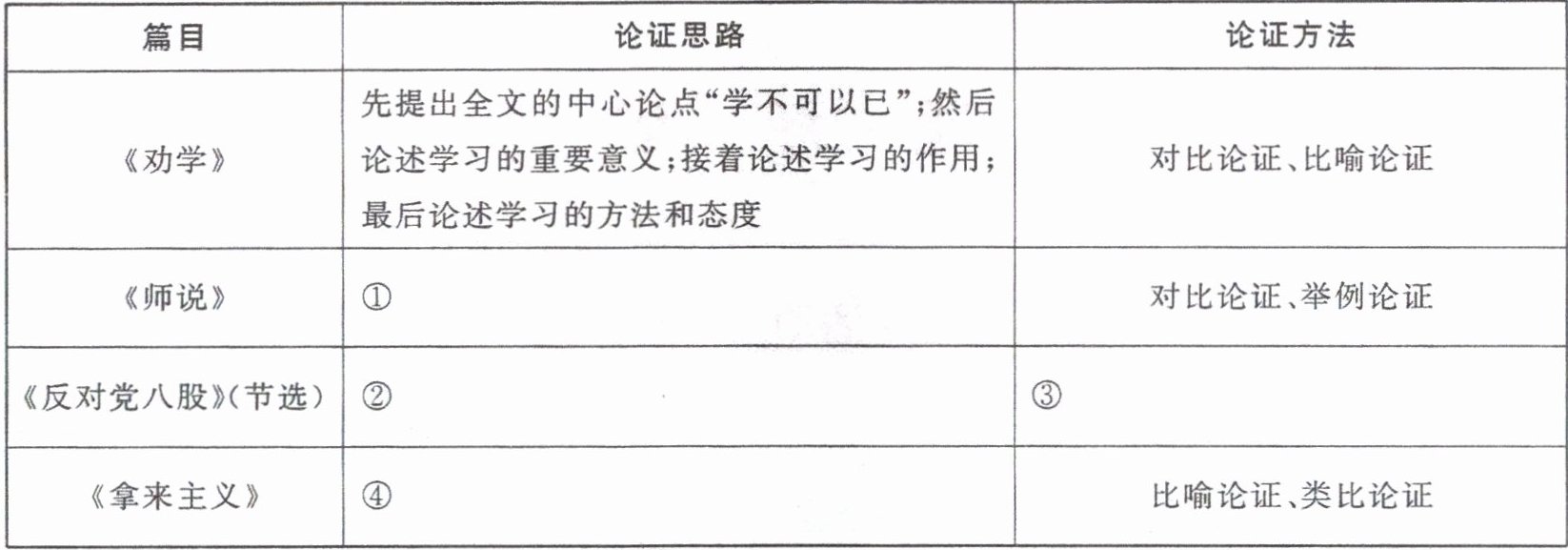 2.①先提出中心观点;然后列举错误现象;接下来以孔子的言行来说明只有从师学习,才能使人懂道理;后以李蟠为楷模,倡导从师的良风 ②先点明主题;然后具体分析党八股的八条罪状,分析其根源并指出克服的办法;最后指出其意义。在具体论证每一条罪状时,采用的是“分项列举,边破边立”和“摆现象—论危害—挖根源—提办法”的论证思路 ③对比论证、举例论证、引用论证 ④先批驳排外的“闭关主义”(略)和媚外的“送去主义”(详),后确立观点“拿来主义”(运用脑髓,放出眼光,自己来拿)。在论证“拿来主义”的过程中,也是先破(孱头、昏蛋、废物)后立(占有、挑选、创新),结构严谨而又论证充分