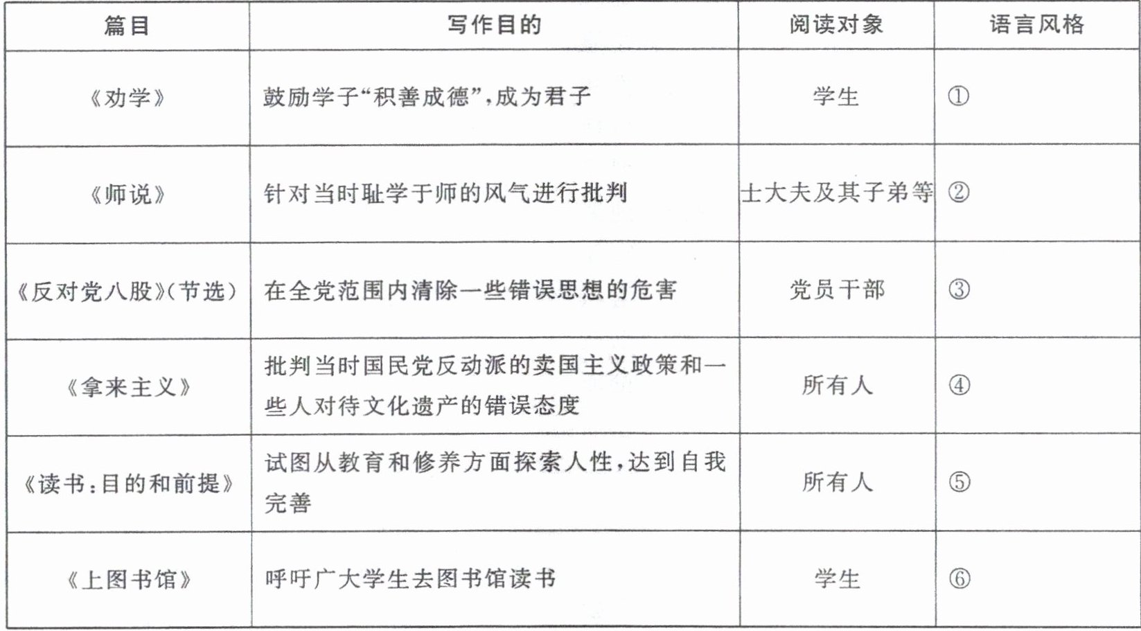 4.①语言深厚严谨,善用比喻,句式整齐,客观冷静 ②态度鲜明,善用对比,文气跌宕,感情充沛 ③语言生动形象,表达新鲜活泼 ④幽默犀利,讽刺性强,观点态度鲜明 ⑤语言准确、简明、生动 ⑥语言含蓄,意味深长