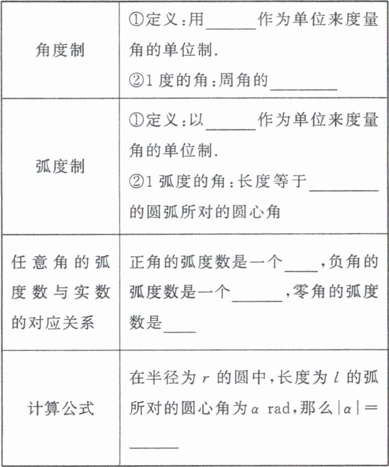 度$\frac{1}{360}$弧度半径长正数负数$0$$\frac{l}{r}$