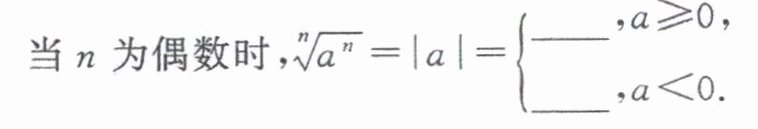 当$n$为偶数时,$\sqrt[n]{a}$有意义的条件是$a\geqslant0$,此时$(\sqrt[n]{a})^n=a$。所以$(\sqrt[n]{a})^n$中,当$n$为奇数时,$a$的取值范围是任意实数;当$n$为偶数时,$a$的取值范围是$a\geqslant0$。
