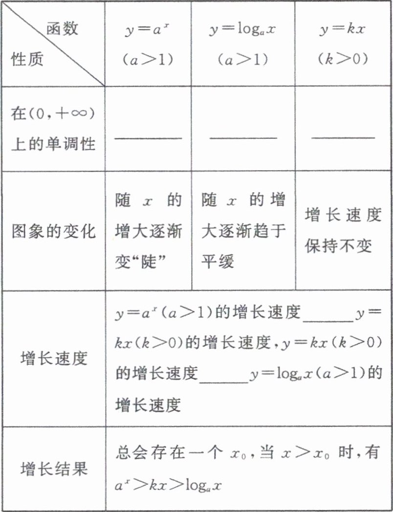 (4)当$a > 1$,$k > 0$时,在区间$(0, +\infty)$内,对任意的$x$,总有$\log_a x < kx < a^x$成立. (