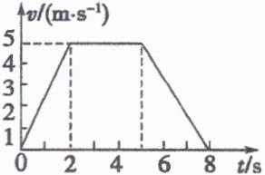 AD 解析:根据 $v-t$ 图像中图线的斜率表示加速度可知,前 $2\mathrm{s}$ 和后 $3\mathrm{s}$ 内图线的斜率均不变,故前 $2\mathrm{s}$ 和后 $3\mathrm{s}$ 内物体的加速度大小均不变,A 正确;$0\sim2\mathrm{s}$ 内物体沿正方向做加速运动,前 $2\mathrm{s}$ 速度的变化量为 $5\mathrm{m/s}$,加速度 $a_1 = \frac{5\mathrm{m/s} - 0}{2\mathrm{s}} = 2.5\mathrm{m/s^2}$,$2\sim5\mathrm{s}$ 物体的速度保持 $5\mathrm{m/s}$ 不变,物体做匀速直线运动,$5\sim8\mathrm{s}$ 物体沿正方向做减速运动,速度的变化量为 $-5\mathrm{m/s}$,加速度 $a_2 = \frac{0 - 5\mathrm{m/s}}{3\mathrm{s}} = -\frac{5}{3}\mathrm{m/s^2}$,B、C 错误,D 正确。