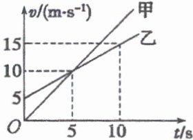 (1)$a_{甲} = \frac{\Delta v_1}{\Delta t_1} = \frac{10\mathrm{m/s} - 0}{5\mathrm{s}} = 2\mathrm{m/s^2}$,$a_{乙} = \frac{\Delta v_2}{\Delta t_2} = \frac{15\mathrm{m/s} - 5\mathrm{m/s}}{10\mathrm{s}} = 1\mathrm{m/s^2}$。