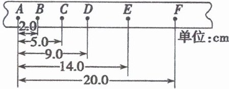 2. 在“探究小车速度随时间变化的规律”的实验中,打点计时器使用的交变电源的频率为 $ 50 \, Hz $,记录小车运动的一段纸带如图所示,在纸带上选取 $ A $、$ B $、$ C $、$ D $、$ E $、$ F $ 六个计数点,相邻两计数点之间还有四个点未画出。