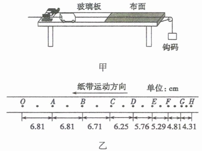 3. 图甲为用打点计时器研究小车运动情况的装置。实验时由静止释放钩码,小车开始做匀加速直线运动,在小车进入布面前钩码已经落地了,小车在平玻璃板上做匀速直线运动,后来在布面上做匀减速直线运动,所打出的纸带的一部分如图乙所示。纸带上相邻两点对应的时间间隔 $ T = 0.02 \, s $。试分析(结果均保留 $ 3 $ 位有效数字):