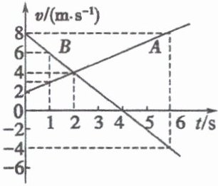 (3)$1 s$末$v_A = v_0 + a_1t_1 = 2 m/s + 1 m/s^2 × 1 s = 3 m/s$,$v_B = v_0 + a_2t_1 = 8 m/s - 2 m/s^2 × 1 s = 6 m/s$,两物体的速度方向都与规定的正方向相同。