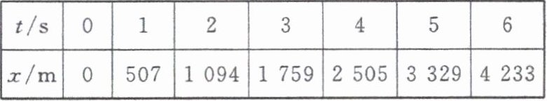 (1)由题表中的数据知第1s内的位移507m,第2s内的位移587m,第3s内的位移665m,第4s内的位移746m,第5s内的位移824m,第6s内的位移904m,则相邻1s内的位移之差近似为一定值,接近$\Delta x=80m$,可判断飞行器在这段时间内做匀加速运动。