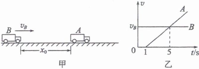 $7.$如图甲所示,$A$车原来临时停在一水平路面上,$B$车在后面匀速向$A$车靠近,$A$车司机发现后启动$A$车,以$A$车司机发现$B$车为计时起点($t = 0$),$A$、$B$两车的$v-t$图像如图乙所示。已知$B$车在第$1\ s$内与$A$车的距离缩短了$x_1 = 12\ m$。