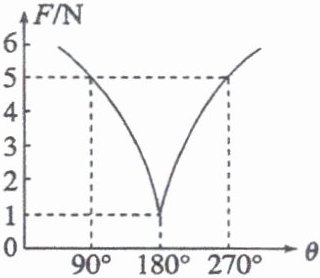 3.解析:设两个分力大小关系为$F_1>F_2$,由题图知当两分力夹角为$90^{\circ}$时,有$\sqrt{F_1^2 + F_2^2}=5N$,当两分力夹角为$180^{\circ}$时,有$F_1 - F_2 = 1N$,联立解得$F_1 = 4N$,$F_2 = 3N$,则合力$F$大小的变化范围是$1\sim7N$。 答案:$1\sim7N$