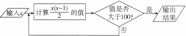105【解析】当x=6时,$\frac{x(x-1)}{2}=\frac{6×(6-1)}{2}=15$,15<100;当x=15时,$\frac{x(x-1)}{2}=\frac{15×(15-1)}{2}=105$,105>100,则输出的数是105.
