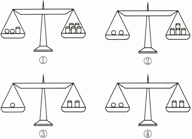 9.(跨学科融合)如图所示的四个天平中,相同形状的物体的质量是相等的,①中天平是平衡的,则②③④中的天平仍然平衡的有(
