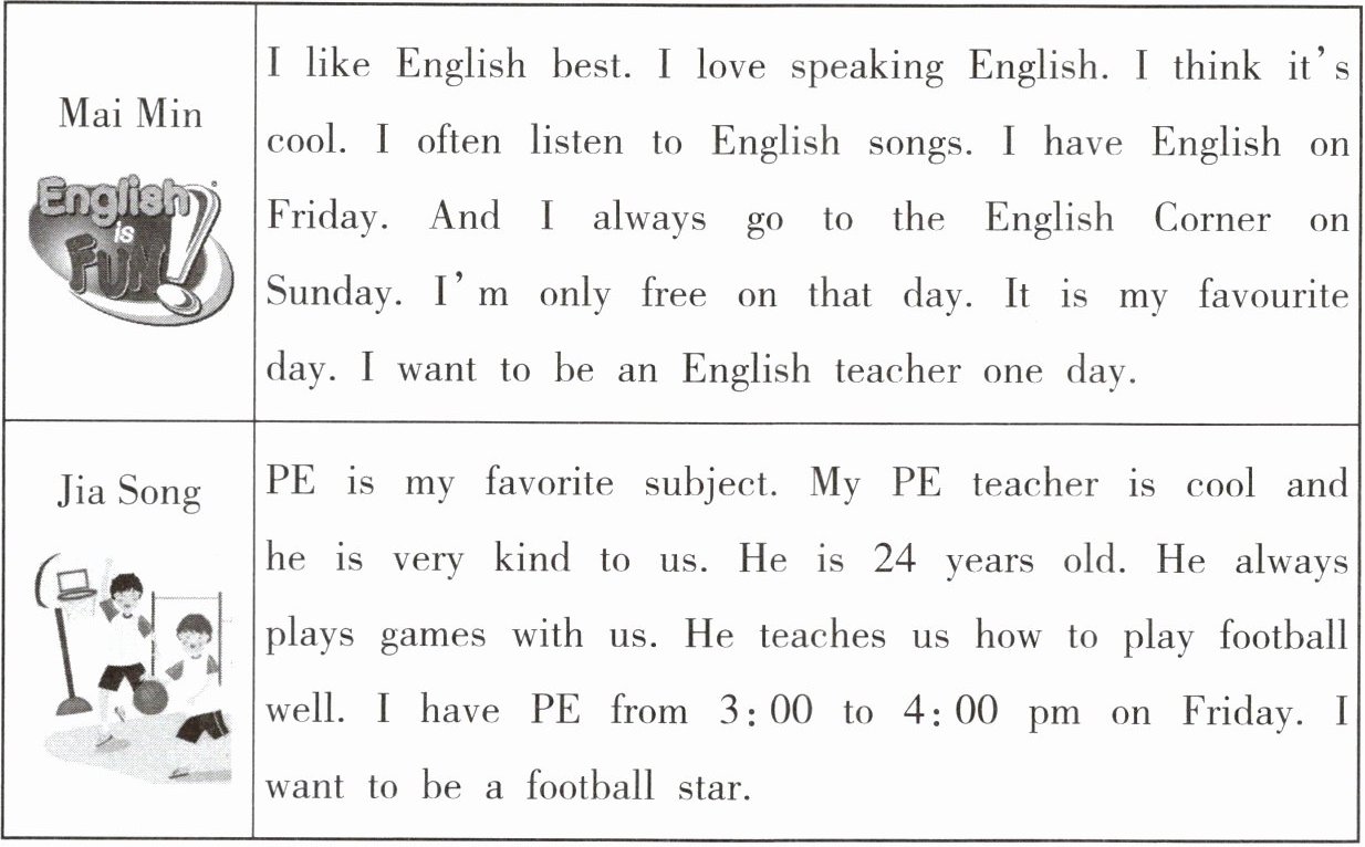 | Jia Song | PE is my favorite subject. My PE teacher is cool and he is very kind to us. He is 24 years old. He always plays games with us. He teaches us how to play football well. I have PE from 3:00 to 4:00 pm on Friday. I want to be a football star. |