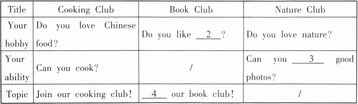 | What to do | Let’s learn to cook your favourite Chinese food. | It’s more than reading. We 6 out stories,talk about books,and 7 new friends. Books can open your mind and make you think. | Come hiking with us every Sunday afternoon! We 8 birds,take photos,and collect plants and insects. We also visit 9 parks. Discover wildlife right under your nose. |