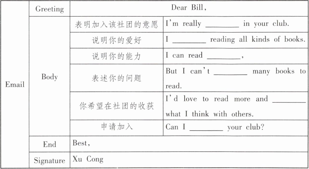 | Greeting | 表明加入该社团的意愿 | Dear Bill,I’m really ____ in your club. |