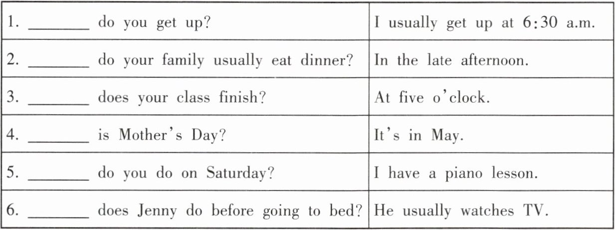 用于询问事物。请用正确的疑问词完成下表:|1. ______ do you get up?|I usually get up at 6:30 a.m.|