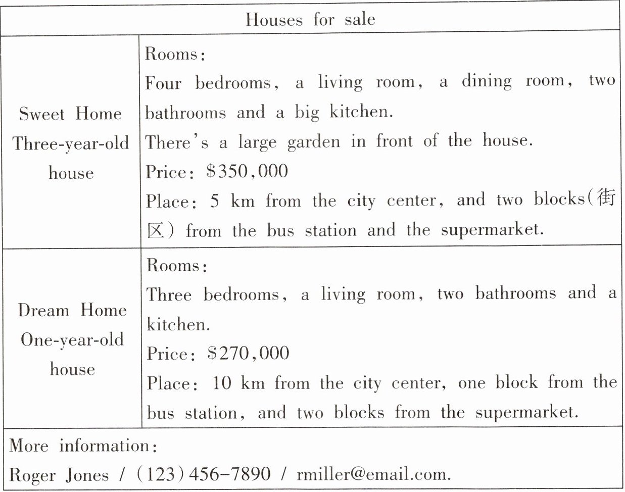Mr and Mrs Miller live in a small house in the city center. Now,they want to buy a big one. They want to get some information of houses online. Here’s the information they get.