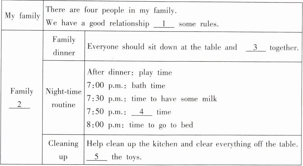 |Family _2_|Family dinnerEveryone should sit down at the table and _3_ together.Night - time routineAfter dinner:play time7:00 p.m.:bath time7:30 p.m.:time to have some milk7:50 p.m.:_4_ time8:00 p.m.:time to go to bedCleaning upHelp clean up the kitchen and clear everything off the table._5_ the toys.|