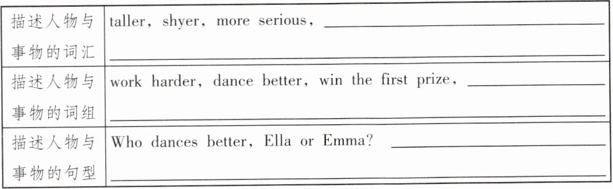 1. 词汇:“more outgoing, more beautiful”(答案不唯一,只要是形容词比较级即可)