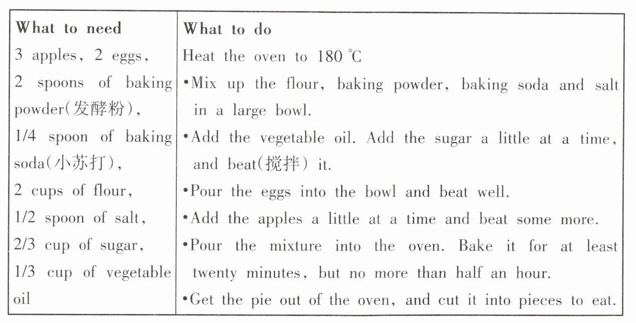 )4. Which of the following is TRUE according to the passage?A. There are eight steps to make the tasty apple pie.