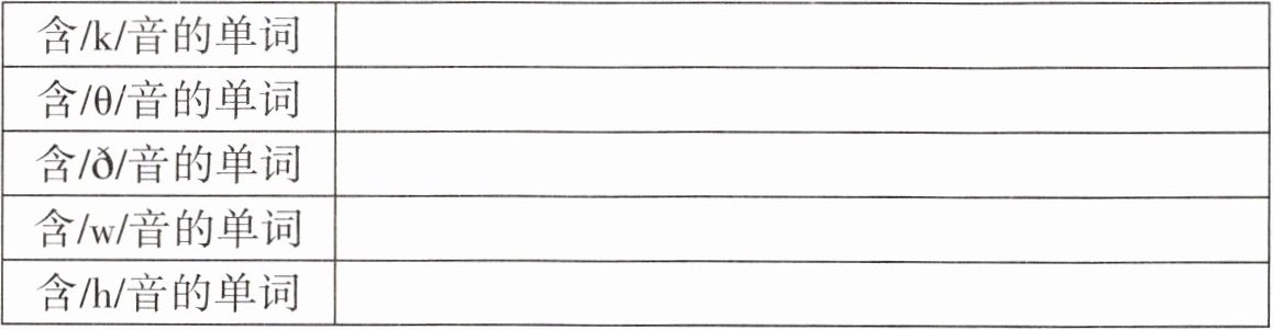 Ⅰ. 从下面的句子中圈出含有/k//θ//ð//h//w/发音的单词,并把他们填入相应的表格。
