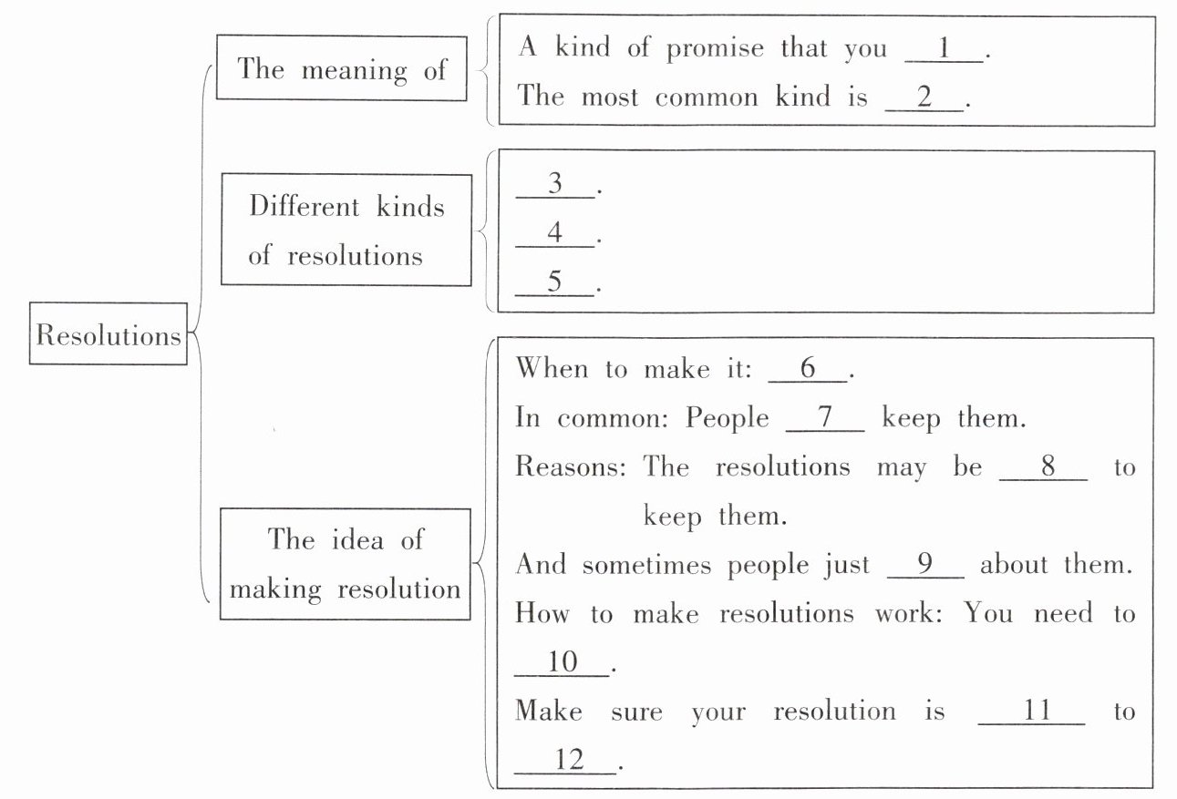 (remind) you of your goals. So what resolutions are you going to make? How are you going to keep them?Task 2: 根据语篇内容,补全结构图。