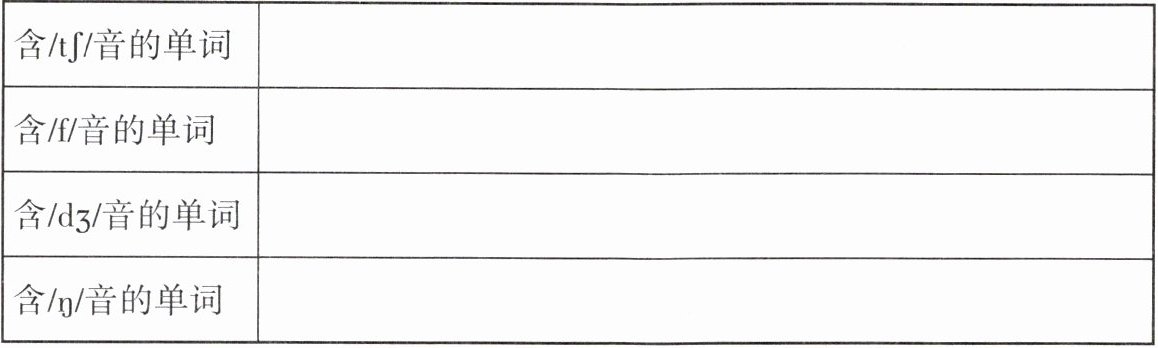 Ⅰ. 从下面的句子中圈出含有/tʃ/、/f/、/dʒ/、/ŋ/发音的单词,并把他们填入相应的表格。