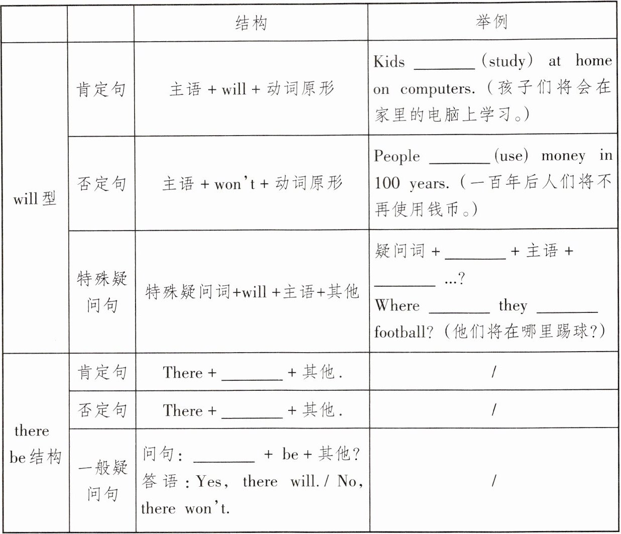 (use) money in 100 years.(一百年后人们将不再使用钱币。)|| |特殊疑问句|特殊疑问词 + will + 主语 + 其他|疑问词 +