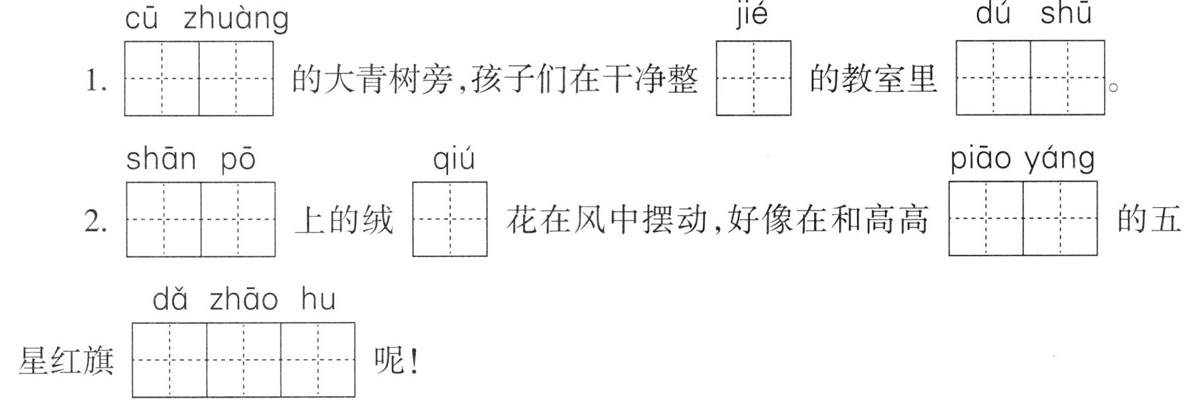 1. 粗壮 洁 读书 2. 山坡 球 飘扬 打招呼