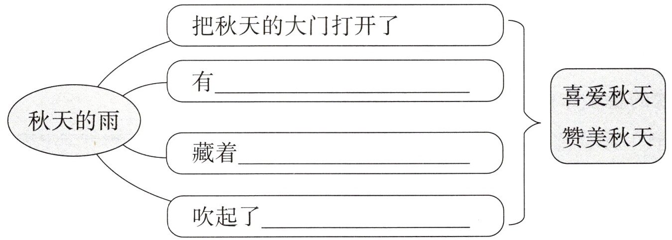 ·的颜料。你看,它把黄色给了银杏树,黄黄的叶子像一把把小扇子,扇哪扇哪,扇走了夏天的炎热。它把红色给了枫树,A,飘哇飘哇,邮来了秋天的凉爽。金黄色是给田野的,看,B。橙红色是给果树的,橘子、柿子你挤我碰,争着要人们去摘呢!菊花仙子得到的颜色就更多了,紫红的、淡黄的、雪白的……美丽的菊花在秋雨里频频点头。②秋天的雨,藏着非常好闻的气味。梨香香的,葡萄甜甜的,还有苹果、橘子,好多好多香甜的气味,都躲在小雨滴里呢!小朋友的脚,常被那香味勾住。