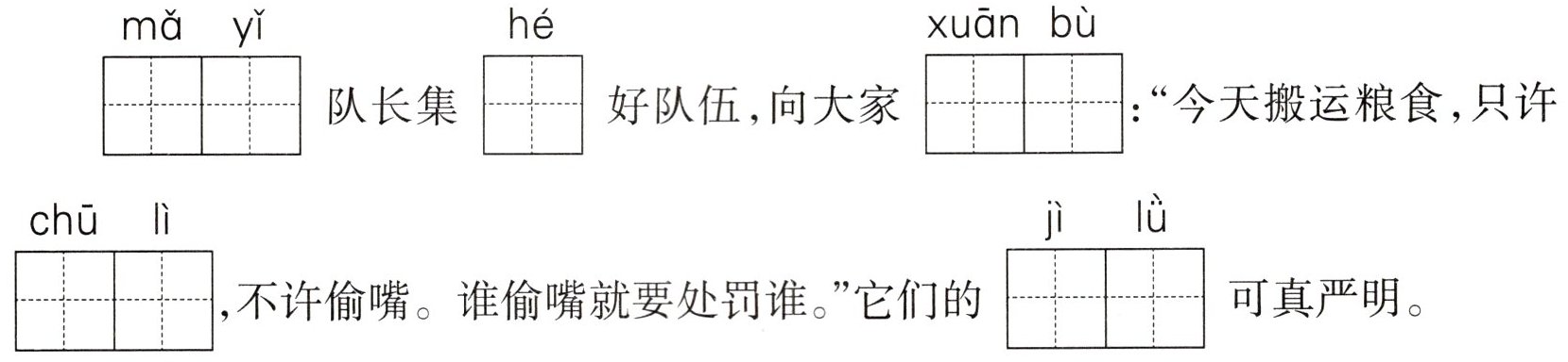 $\left\{\begin{array}{l}\underset{\cdot }{稍}(shāo shào)息\\ \underset{\cdot }{稍}(shāo shào)微\end{array} \right.$ $\left\{\begin{array}{l}处(chǔ chù)罚\\ 到处(chǔ chù)\end{array} \right.$ $\left\{\begin{array}{l}禁(jīn jìn)受\\ 禁(jīn jìn)止\end{array} \right.$