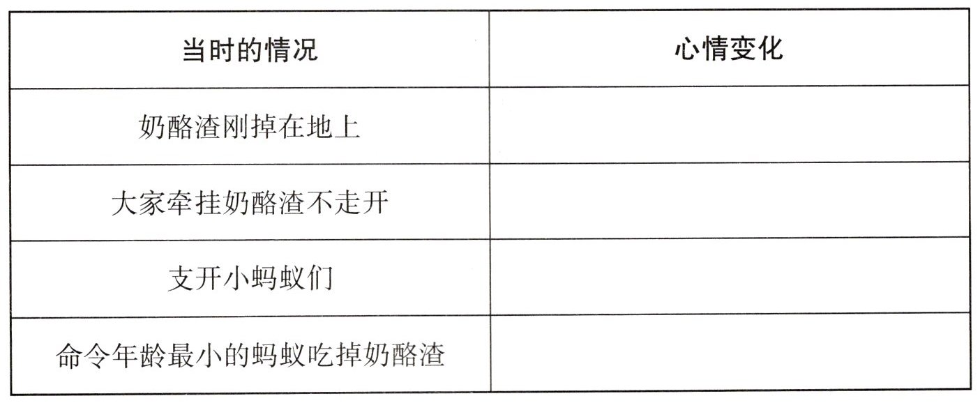 四、蚂蚁队长在搬运奶酪的过程中心情有哪些变化?填写下面的表格。(填序号)