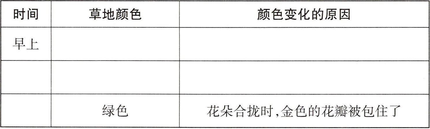 有一天,我起得很早去钓鱼,发现草地并不是金色的,而是绿色的。中午回家的时候,我看见草地是金色的。傍晚的时候,草地又变绿了。这是为什么呢?我来到草地上,仔细观察,发现蒲公英的花瓣是合拢的。原来,蒲公英的花就像我们的手掌,可以张开、合上。花朵张开时,花瓣是金色的,草地也是金色的;花朵合拢时,金色的花瓣被包住了,草地就变成绿色的了。