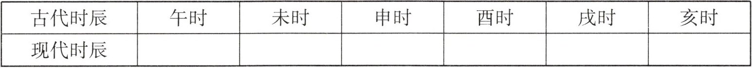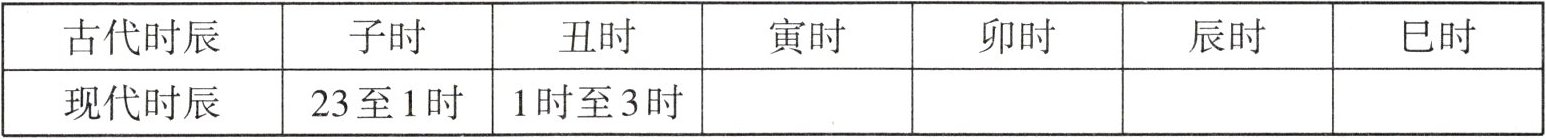 二、我国古人把一天的时间平均分成12个时辰,分别是子时、丑时、寅时、卯时、辰时、巳时、午时、未时、申时、酉时、戌时、亥时。请用24时记时法把下表补充完整。