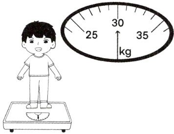 3. 在最新的儿童身高体重参考标准中,8岁的女孩标准体重约为25千克,男孩标准体重约为27千克。小明(男孩)今年8岁,他给自己称了体重(右图),他的体重是(