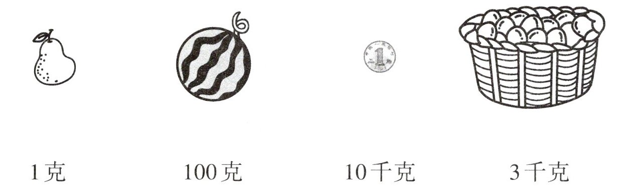梨连100克,西瓜连3千克,1元硬币连1克,一筐桃子连10千克。